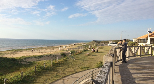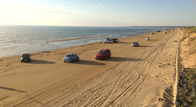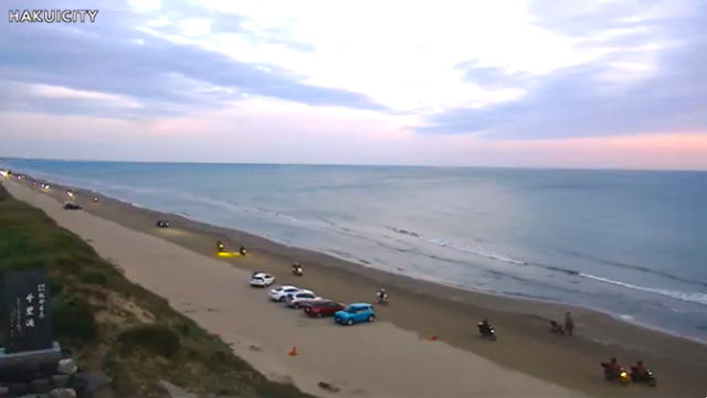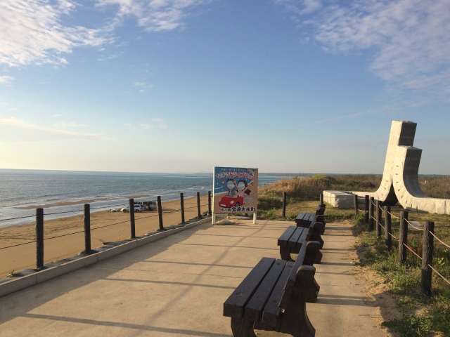 車から降りると、海の方へ向って階段がありました。何だろう?と思い行ってみると…、なんと!「千里浜なぎさドライブウェイ」が目の前に見えるではありませんか!知らなかった…。 そして、階段を下りると「千里浜なぎさドライブウェイ」に徒歩で入れるようになっていました。夕暮れ近くでしたがまだ車やバイクが走っていました。 「千里浜なぎさドライブウェイ」は日本で唯一、世界でも珍しい「車で波打ち際を走れる砂浜の道路」です。もちろんノーマルタイヤで大丈夫。バスでもバイクでも自転車でも馬でもOK。 全長約8kmで無料。夏は海水浴客でも賑わっています。ドライブ好きの人にはぜひともお勧めしたい場所です。 ここでも書きましたが、バイク乗りの人は駐車用に小さな板きれ等を用意してきて下さい。サイドスタンドが砂に埋もれてバイクが倒れないようにするためです。 ただ、天候次第で通行止めになりますので、こちらで当日の最新情報を確認してください。のと里山海道の電光掲示板も要チェック。 丘側の白っぽく乾いた砂の部分は走らないように。黒く湿った砂の部分を走行してください。 そして、この千里浜なぎさドライブウェイを走った後は車のメンテナンスをお忘れなく。 「道の駅 のと千里浜」には、無料で車体下部の砂や海水を流せる「タイヤシャワー」がありますので、ドライブの後に利用すると良いでしょう。 その他、道の駅 のと千里浜には足湯もあります(冬季閉鎖)。また、ドライブ所要時間が分かる「なんぷんまっぷ」などもあり、能登観光の参考になると思います。 ※千里浜なぎさドライブウェイへの入り口は、「今浜IC口」「柳瀬口」「千里浜IC口」「千里浜北口」がありますが、金沢方面からの場合は「今浜IC口」からどうぞ。 |