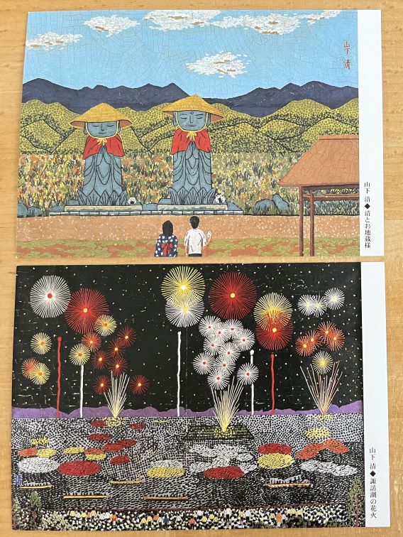 | これまで何度も通っていたのに山下清氏の美術館があるとは全く気付きませんでした。旅行前にたまたまマップで知った「放浪美術館」。確かに道路には大きな看板が出ています。今回、機会があれば行ってみようと思い、前もってネットで割引券をゲット。 一般的な美術館とは違い、母にも馴染み深い人物の美術館なので気軽に入館できます。美術館の入り口には山下清と言えば〜の石で作ったおにぎりがいっぱい並んでいてユニーク。 入場料を支払うと一人1枚絵ハガキがもらえます。割引券持参だったので一人2枚もらえました。絵柄は選べます。 思っていた以上に館内の作品数が多く、テレビなどで見たことのある作品も。順路に沿ってゆっくり見ることができました。 展示室の出口付近で喋っていると、突然女性スタッフが登場。そこからはスタッフに主な作品を詳しく解説していただきました。見落としていたトリックにも似た技法や立体感などを、解説に合わせて改めて確認。↑の画像の絵ハガキの中には文字が隠されています。何と言う文字が隠れているか分かるでしょうか。何だかこどもの頃に受けた色盲検査みたい。 出口には懐かしい骨董品がたくさん並んだ販売コーナーがあります。 「諏訪SA」でおみやげ購入タイム。このドライブルートだと、やはり夕食はおぎのやの「峠の釜めし」になります。露店で購入しようか迷ったのですが、2年前と違ってまだ時間は早めだったのでSAで購入できました。 |
